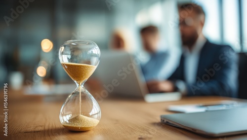 Time is of the essence as the hourglass counts down during a business meeting, emphasizing the importance of deadlines and efficient collaboration in a modern office environment.