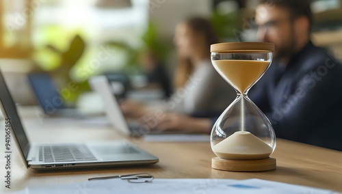 Time Management at Work: An Hourglass on a Busy Office Desk