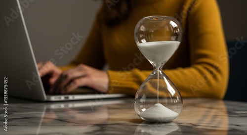 Time Management Concept: Hourglass on Marble Table with Blurred Person Working on Laptop in Background, Emphasizing Deadline and Productivity