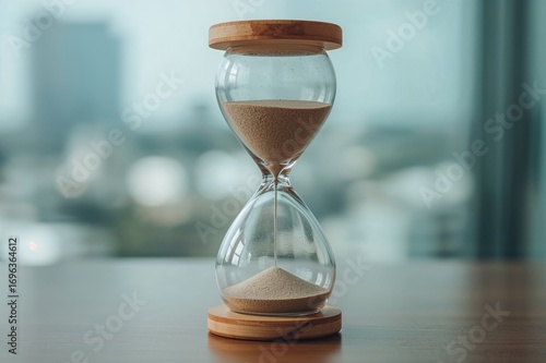 Time management concept with an hourglass and sand on a surface with a soft-focus backdrop