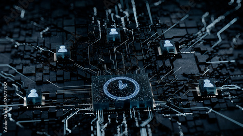 Time Technology Concept with clock symbol on a Microchip. White Neon Data flows between Users and the CPU across a Futuristic Motherboard. 3D render.