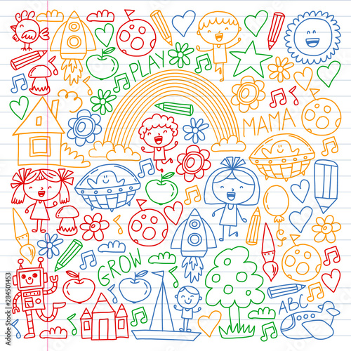 Time to adventure. Imagination creativity small children play nursery kindergarten preschool school kids drawing doodle icons pattern, play, study, learn with happy boys and girls Let's explore space