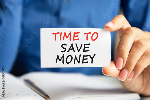 time to save money written on a paper card in woman hand