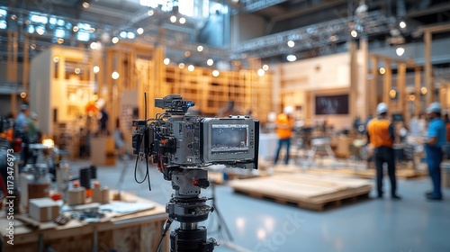 Time-lapse setup showing exhibition booth construction, workers in motion