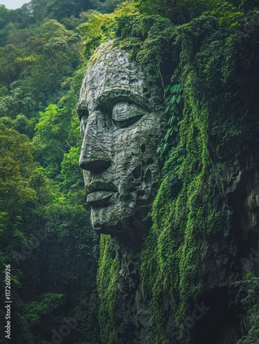 Timeless Stone Face Draped in Lush Jungle Vines and Foliage