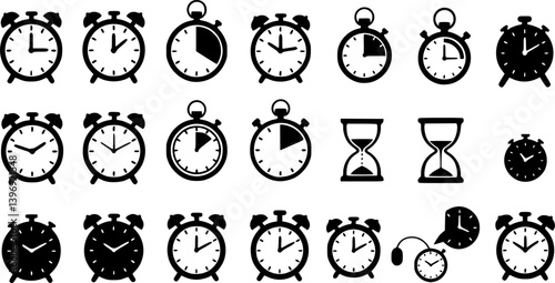 Timers and clock icon set. Time line symbol. Containing clock, stopwatch, hourglass and more Vector illustration