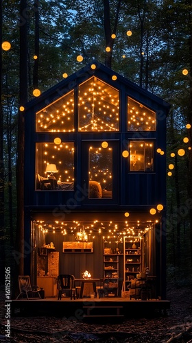 Tiny Cabin Lit by String Lights.