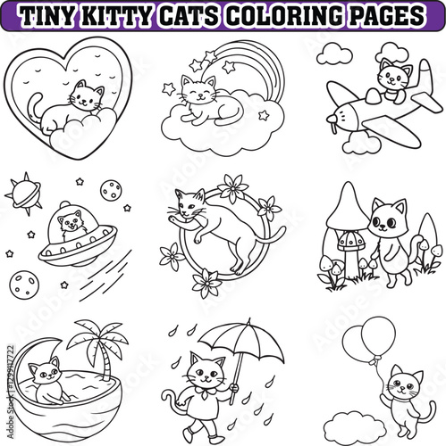 Tiny cats coloring pages, kitty coloring page, cat coloring page, bold and easy coloring pages, line art illustration, black and white