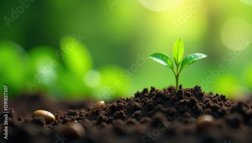 Tiny coffee bean seedlings emerge from soil in lush green forest environment, plant growth, coffee bean