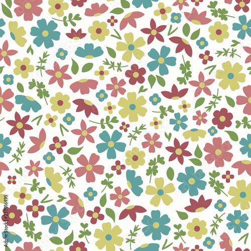 Tiny colorful flowers and leaves on white background seamless vector pattern