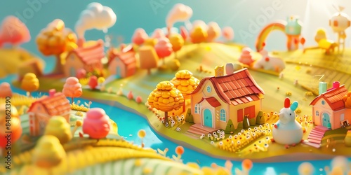 Tiny cute isometric A beautiful rainbow village morning scene. Sunlight shines on the golden wheat field and dozens of small animals are busy. Describe the rainbow village morning scene, 2:1