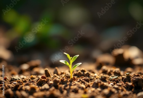 Tiny green sprout emerges from soil, bathed in warm sunlight, macro photography, natural