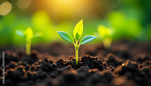 Tiny Green Sprout Emerging from Fertile Soil, Bathed in the Warm Glow of Dawn
