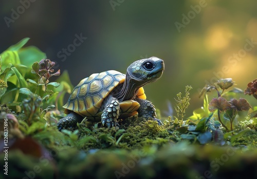Tiny Green Turtle Exploring Lush Green Environment with Bright Colors in Soft Morning Light, Capturing Nature's Beauty and Serenity in a Fantasy Setting