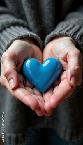 Tiny hands holding a miniature heart with Ukrainian blue color, close-up, miniature heart