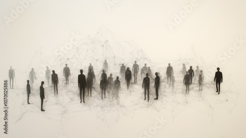 Tiny human-like figures linked together create a delicate network over a soft gradient backdrop. AI generated