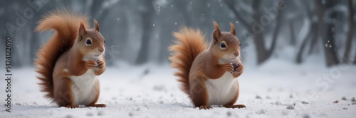 Tiny red squirrel gathers nuts amidst a blizzard, winter scene , rodent, animal photography, wildlife