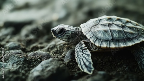 Tiny sea turtle hatchling crawls on dark beach pebbles.