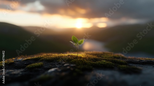Tiny sprout emerging from mossy rock, bathed in golden sunset light. A vibrant new beginning against a majestic mountain backdrop