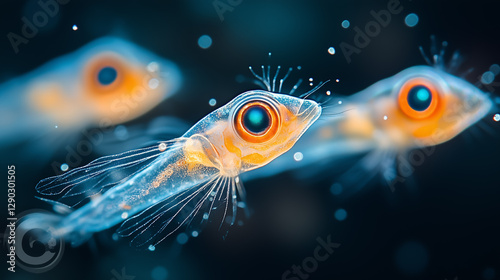 Tiny transparent fish swim gracefully in an underwater habitat filled with bubbles and swirling currents near a coral reef