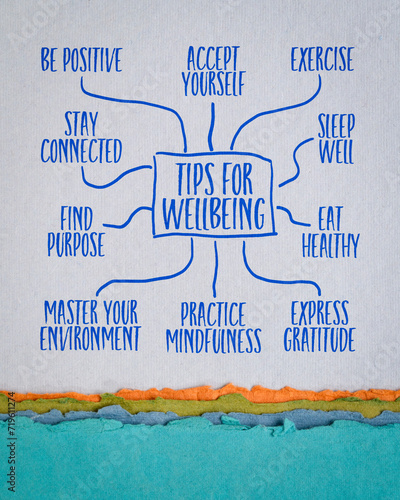 tips for wellbeing - infographics or mind map sketch on art paper, healthy lifestyle concept