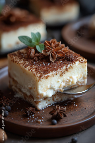 Tiramisu gourmand au chocolat et café, garni de cacao en poudre et d'étoiles d'anis, avec une cuillère capturant une bouchée savoureuse