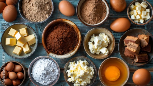 Tiramisu ingredients cocoa, coffee, mascarpone on turquoise wood backdrop for dessert making