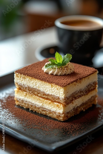 Tiramisu, served on dark slate. Italian tiramisu cake. studio lighting.