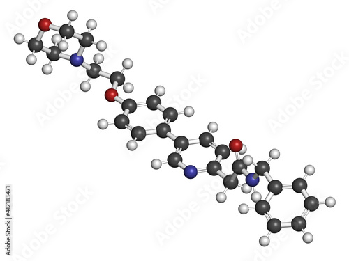 Tirbanibulin actinic keratosis drug molecule. 3D rendering. Atoms are represented as spheres with conventional color coding: hydrogen (white), carbon (grey), nitrogen (blue), oxygen (red).