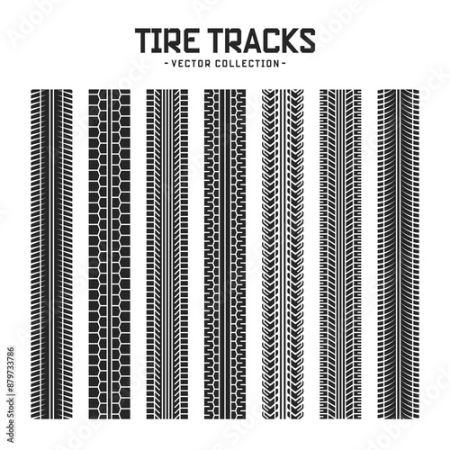 Tire tracks, wheel braking marks. Truck, car or motorcycle tread pattern silhouettes. Auto race, motorsport, speed racing design element. Vector illustration