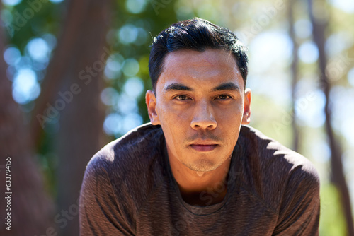 Tired and sweaty Asian man takes a break while trail running, breathing