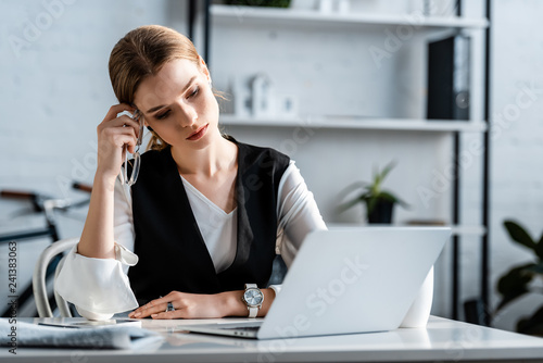 tired businesswoman in formal wear sitting at computer desk at workplace