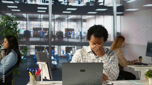 Tired frustrated CEO working under pressure to solve important tasks, dealing with professional struggles and mental exhaustion. African american man feeling overwhelmed. Camera B.