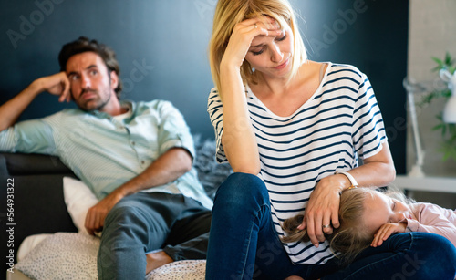 Tired mother and father sitting on couch feels annoyed exhausted stressful with little girl child.