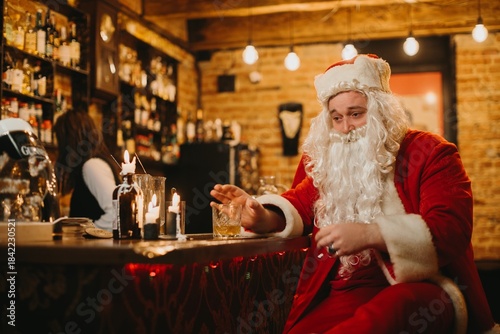 Tired santa claus unwinding at a bar