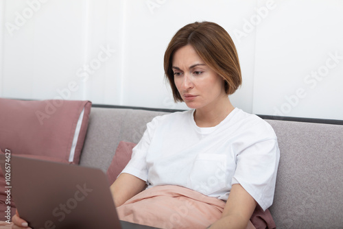Tired woman lying on bed and working on laptop. Yawning girl looking at the screen of notebook in the bedroom