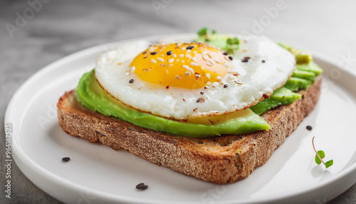 Toasted bread with avocado and fried egg. Delicious and healthy sandwich. Cooking and culinary