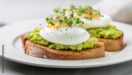 Toasted bread with smashed avocado, poached egg and microgreens. Healthy brunch. Tasty food