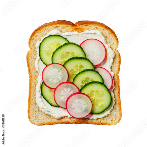 Toasted white bread with cream cheese, cucmber and radishes isolated on white background