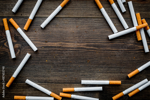 Tobacco. Scattered cigarettes on dark wooden background top view copy space