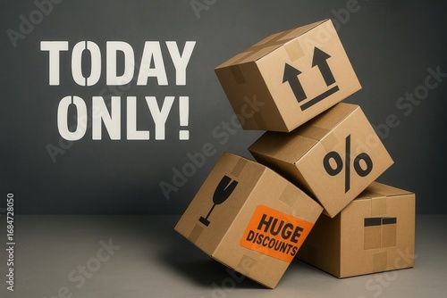 TODAY ONLY! banner featuring HUGE DISCOUNTS on stacked cardboard boxes, modern retail sale promotion, dynamic design.