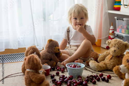 Toddler blond child, cute boy, eating cherries with teddy bears