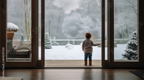 Toddler child standing in front of a big french doors, leaning against it looking outside at a snowy nature
