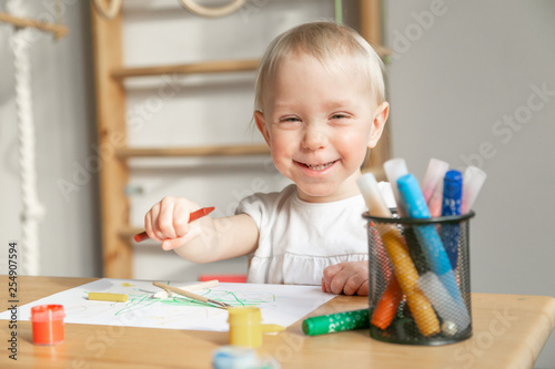 Toddler girl painting in kindergarden, art class