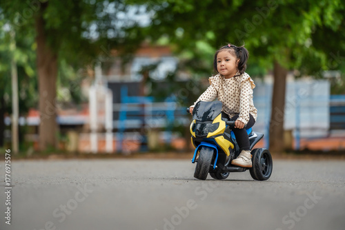 toddler girl riding an electric motorcycle toy in park
