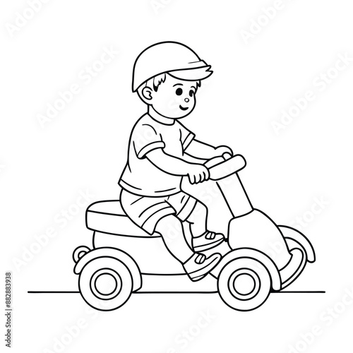 toddler sitting on a toy car. line art vector illustration