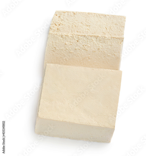 Tofu cheese isolated on white background. Diced tofu Top view. Flat lay. Food concept..