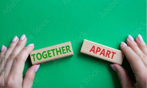 Together or Apart symbol. Concept word Together or Apart on wooden blocks. Businessman hand. Beautiful green background. Business and Together or Apart concept. Copy space