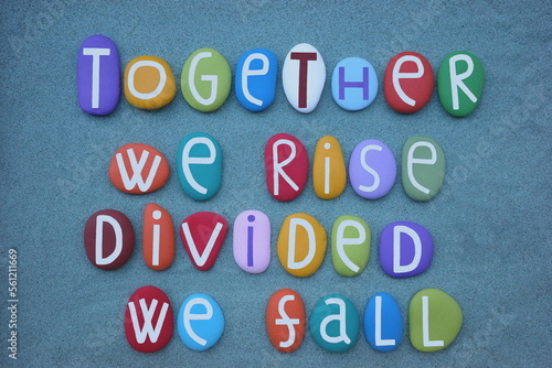 Together we rise, divided we fall, creative quote composed with multi colored stone letters over green sand