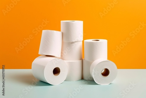 Toilet paper rolls stacked in studio background. Ai generated.